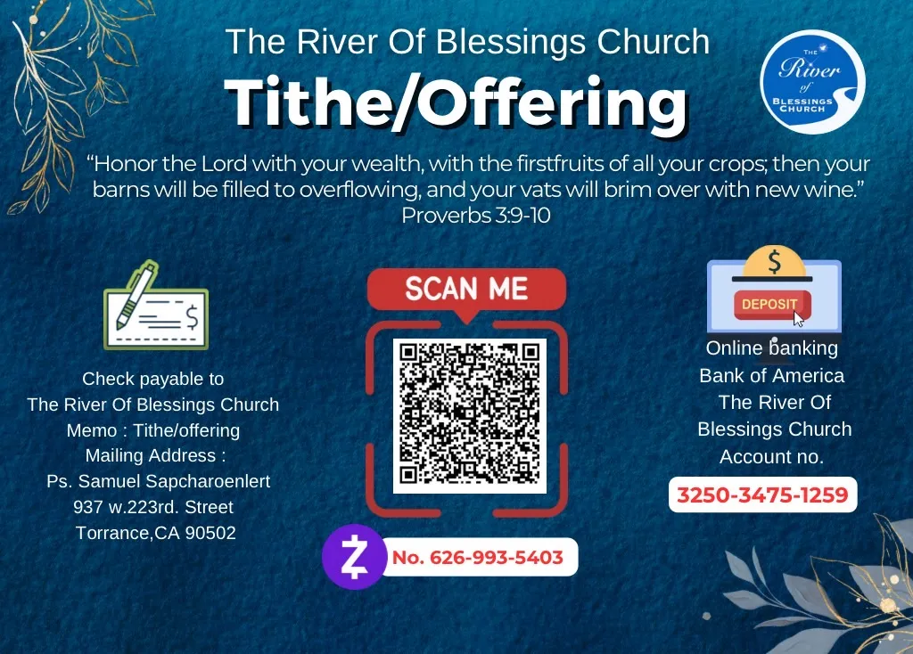 At River of Blessings Church L.A., giving is an act of worship and faith. Your generosity helps us spread the Gospel, support ministries, and bless our community. Here are the ways you can give: